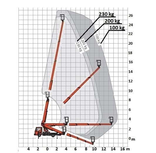 W oparciu o przedstawiony wykres pola pracy wskaż maksymalny wysięg platformy roboczej obciążonej masą 230 kg uniesionej na wysokość 17 m: