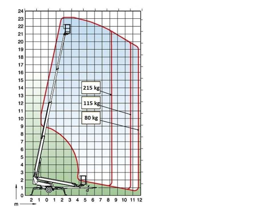 W oparciu o przedstawiony wykres pola pracy wskaż maksymalny wysięg platformy roboczej obciążonej masą 215kg uniesionej na wysokość 22 m: