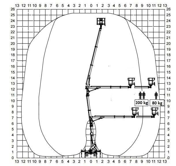 W oparciu o przedstawiony wykres pola pracy wskaż maksymalny wysięg platformy roboczej obciążonej masą 200 kg uniesionej na wysokość 22 m: