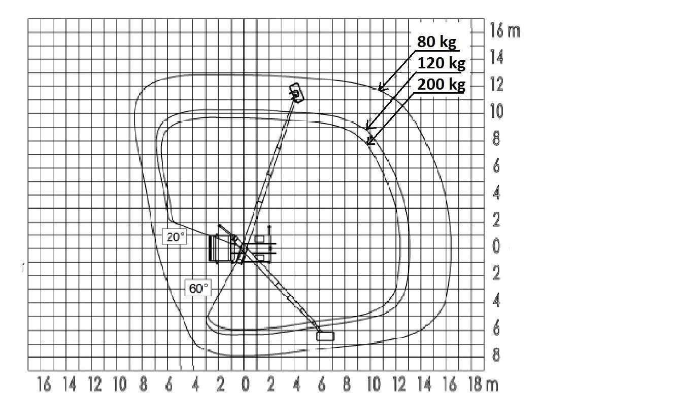 W oparciu o przedstawiony wykres pola pracy określ maksymalne dopuszczalne obciążenie platformy roboczej uniesionej na wysokość 16 m i wysięgu 8 m: