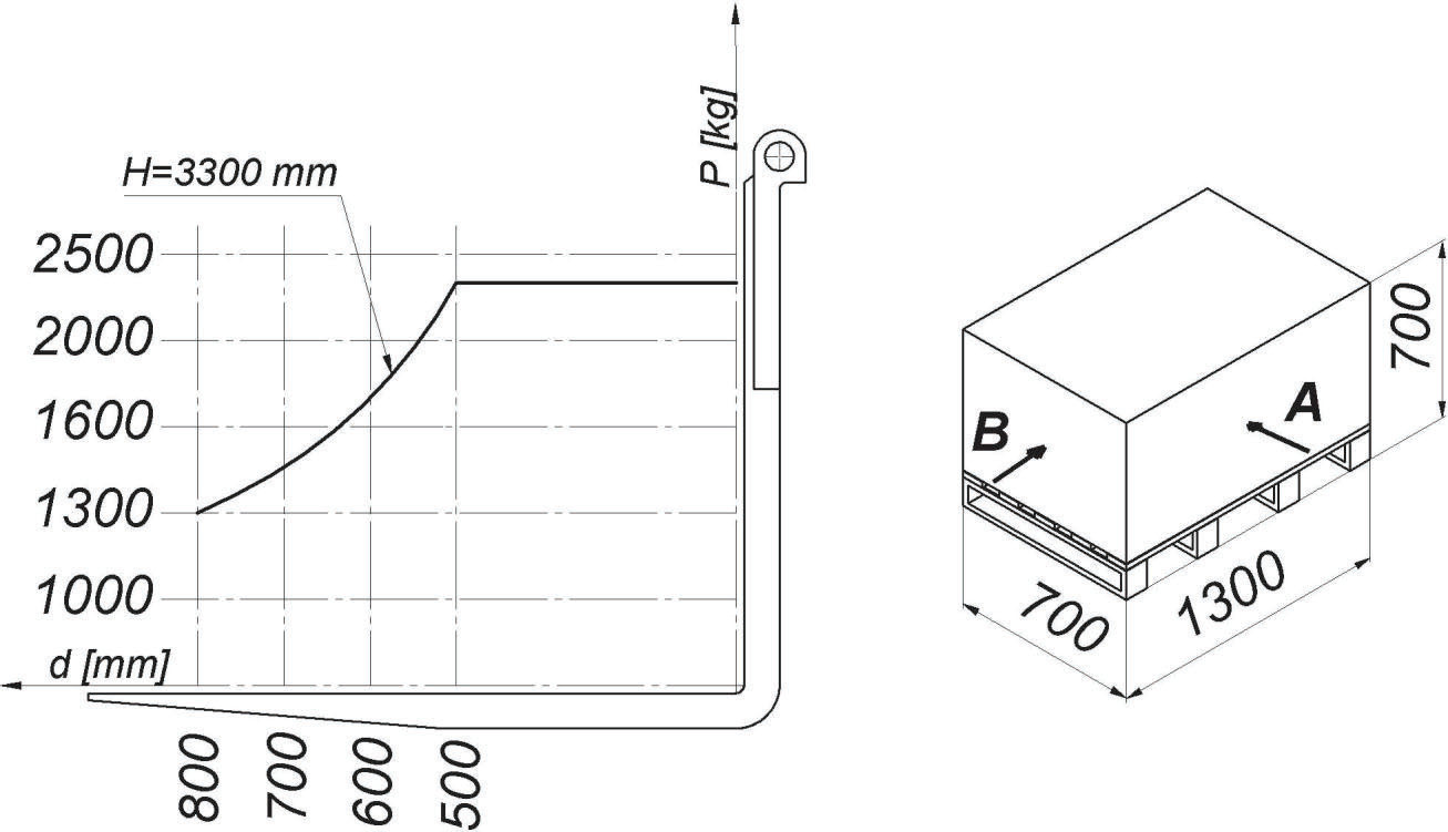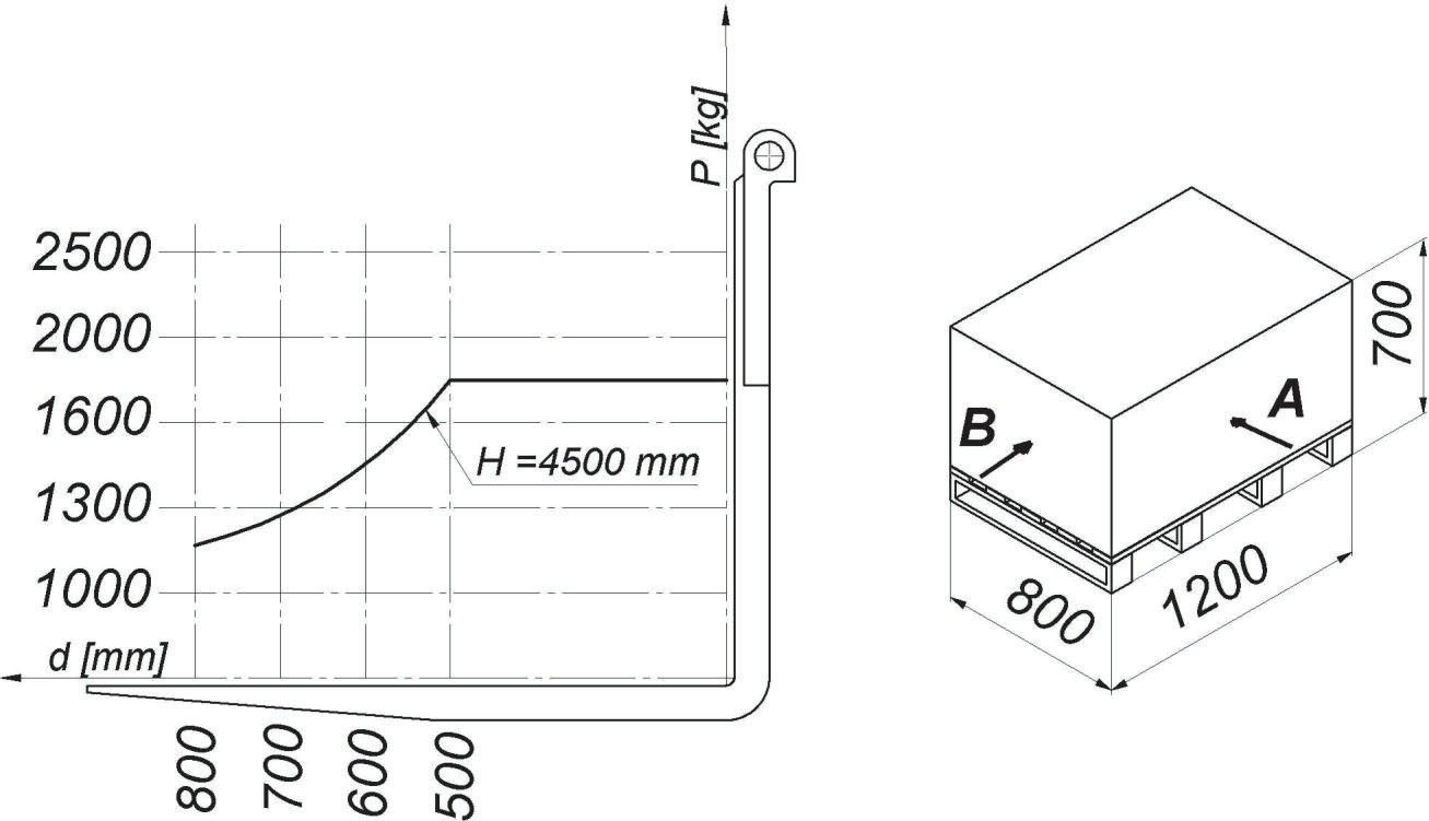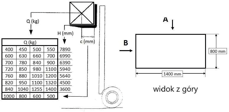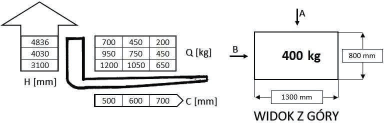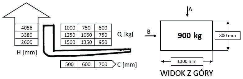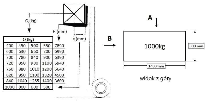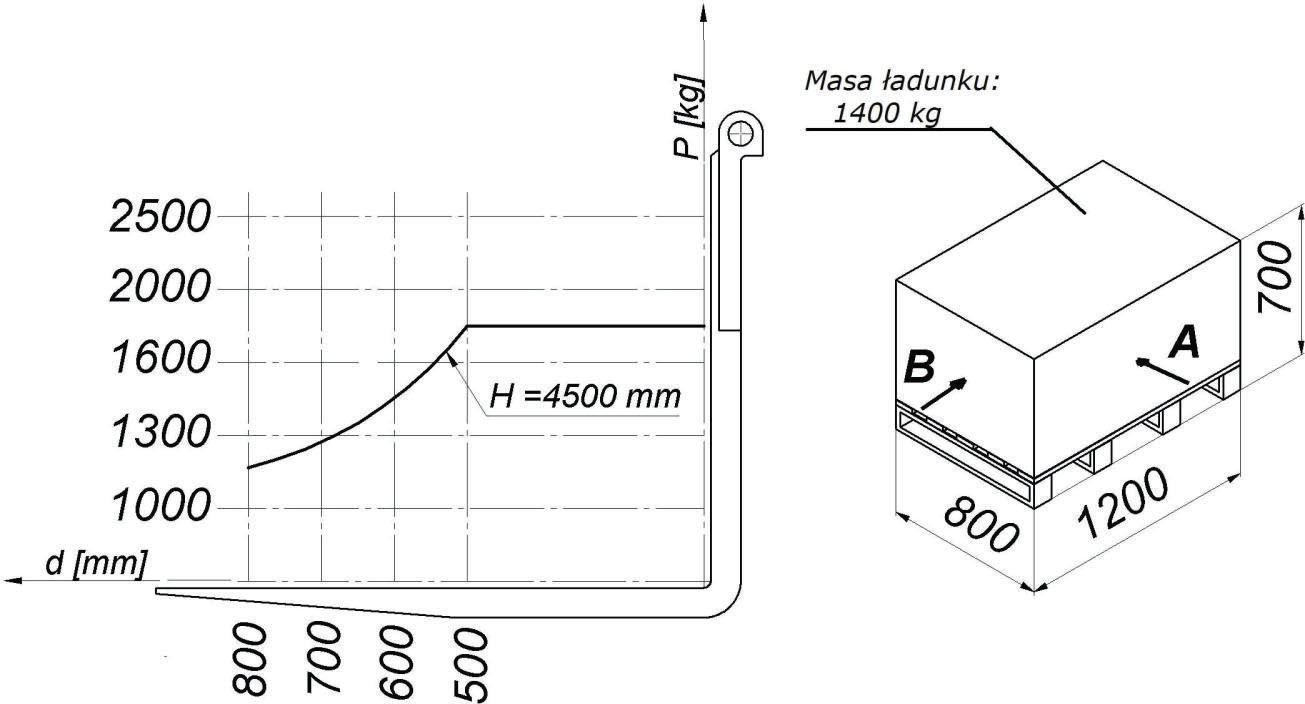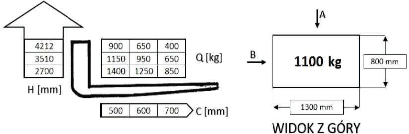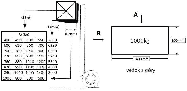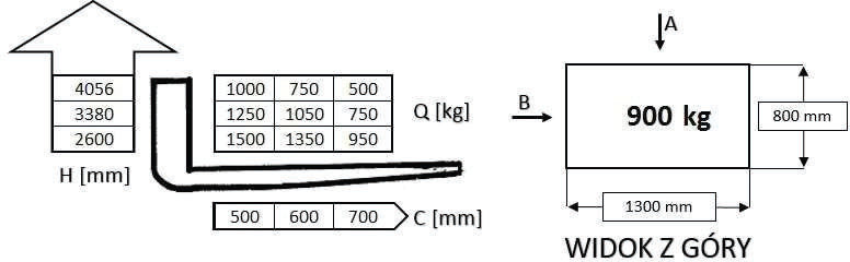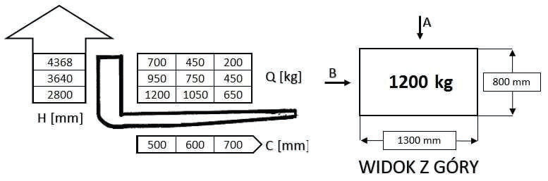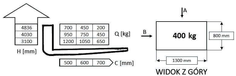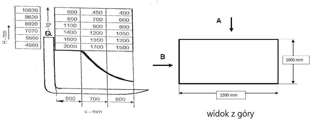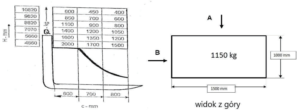 W oparciu o przedstawiony diagram udźwigu i rysunek określ maksymalną bezpieczną wysokość podnoszenia ładunku pobranego od strony A: