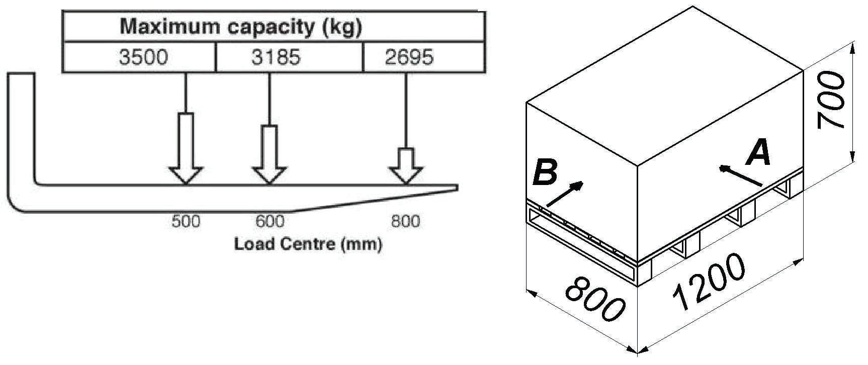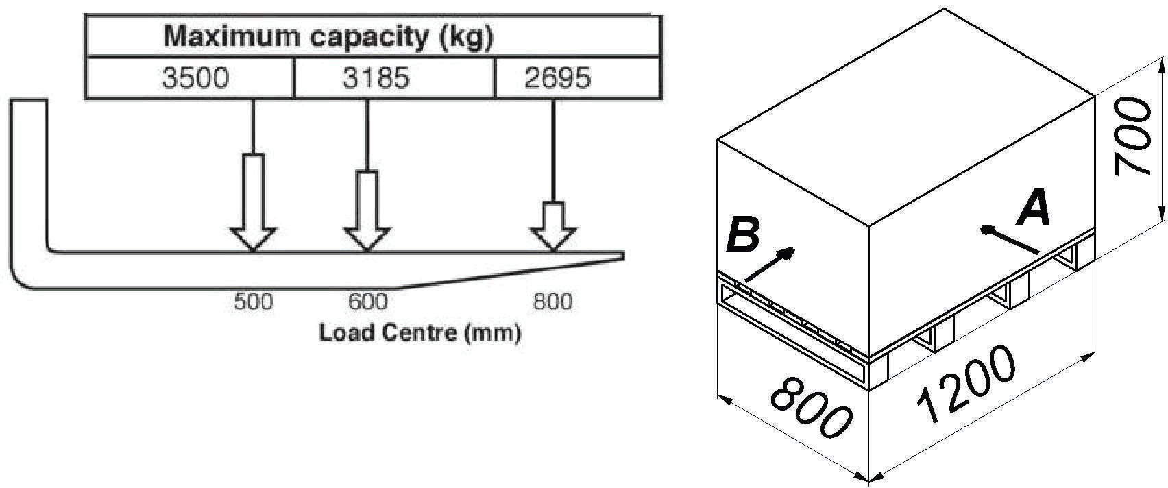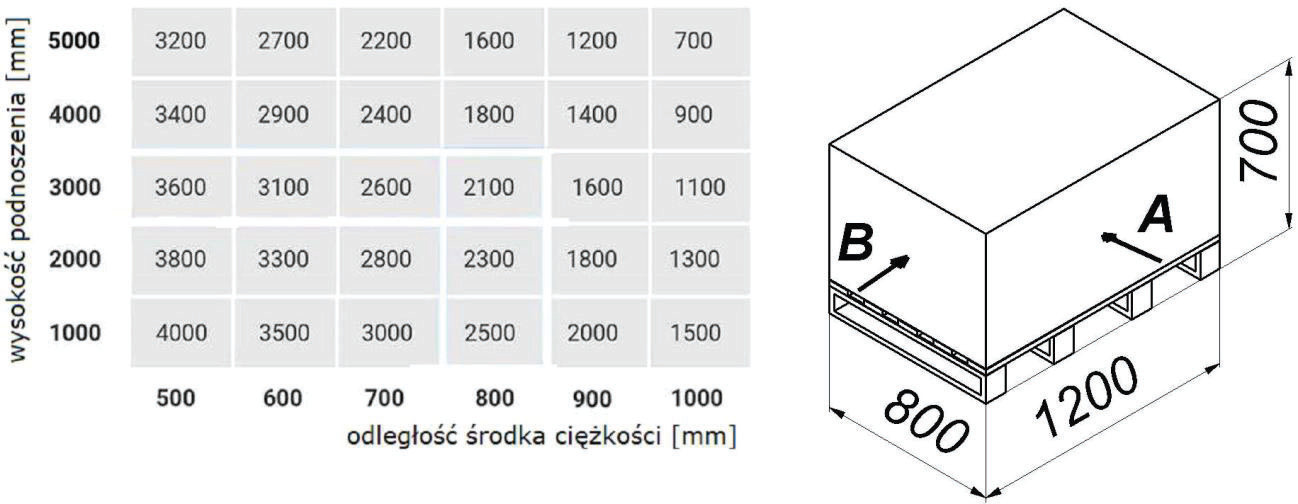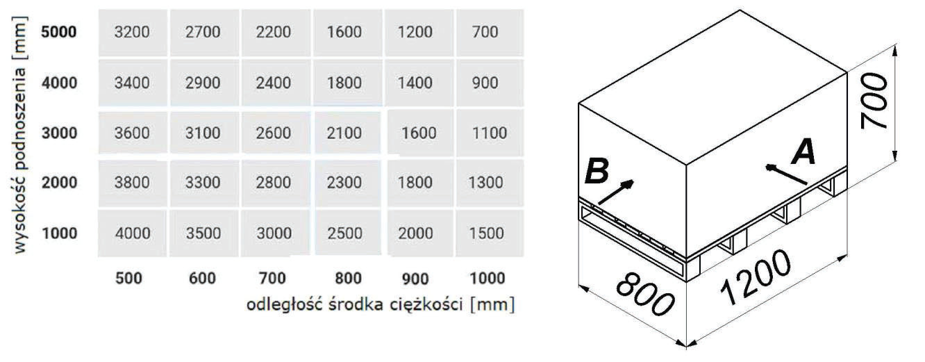 W oparciu o przedstawiony diagram udźwigu oraz rysunek określ maksymalną masę ładunku jaką można bezpiecznie podnieść na wysokość 4000 mm, pobierając od strony B: