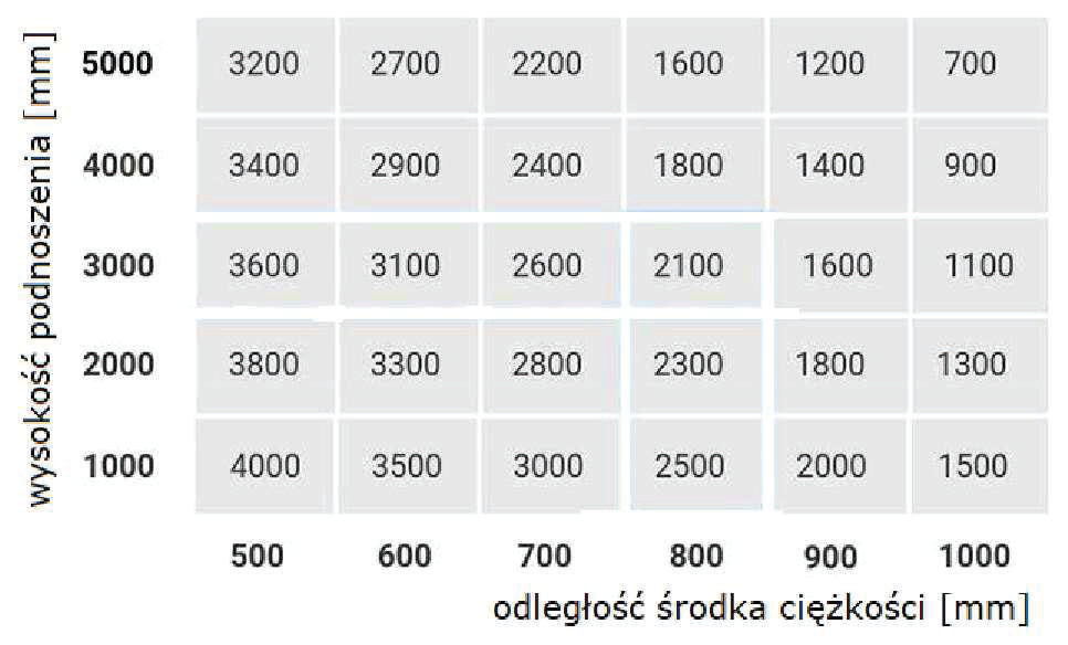 W oparciu o przedstawiony diagram udźwigu określ maksymalny udźwig wózka, podnoszącego ładunek na wysokość 3000 mm: