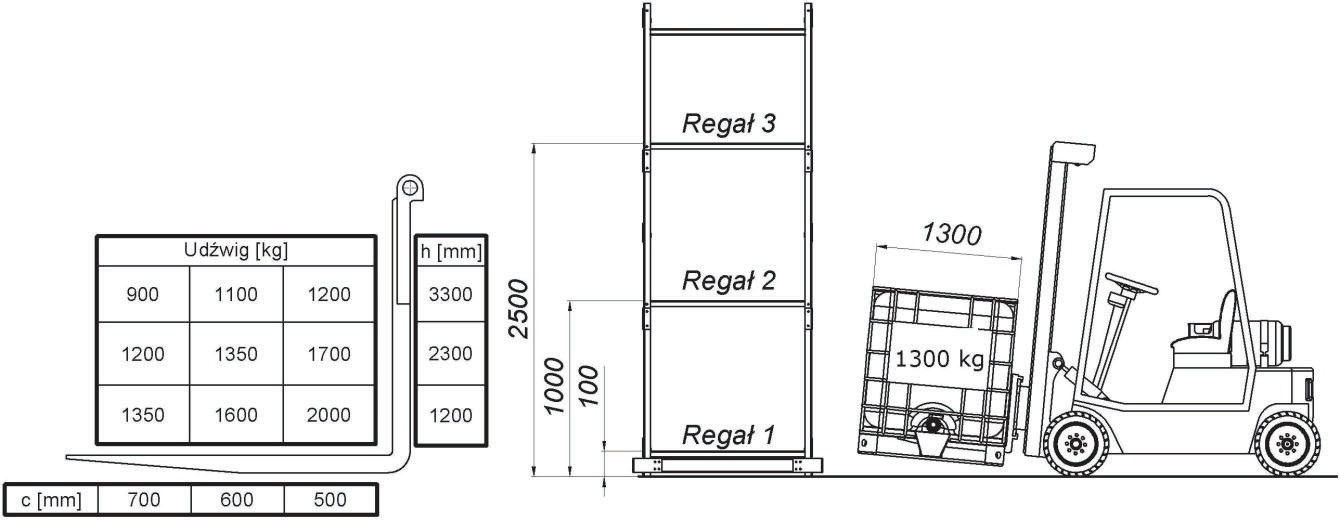 W oparciu o przedstawiony diagram udźwigu oraz rysunek wskaż, na który regał lub regały można postawić ładunek: