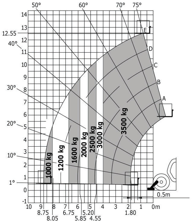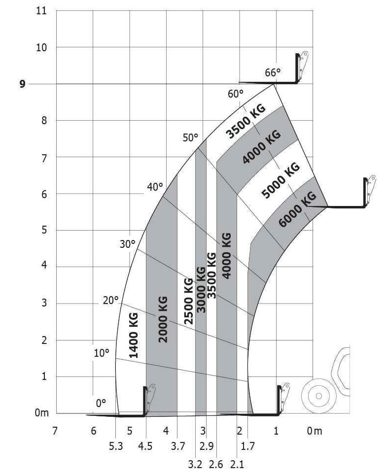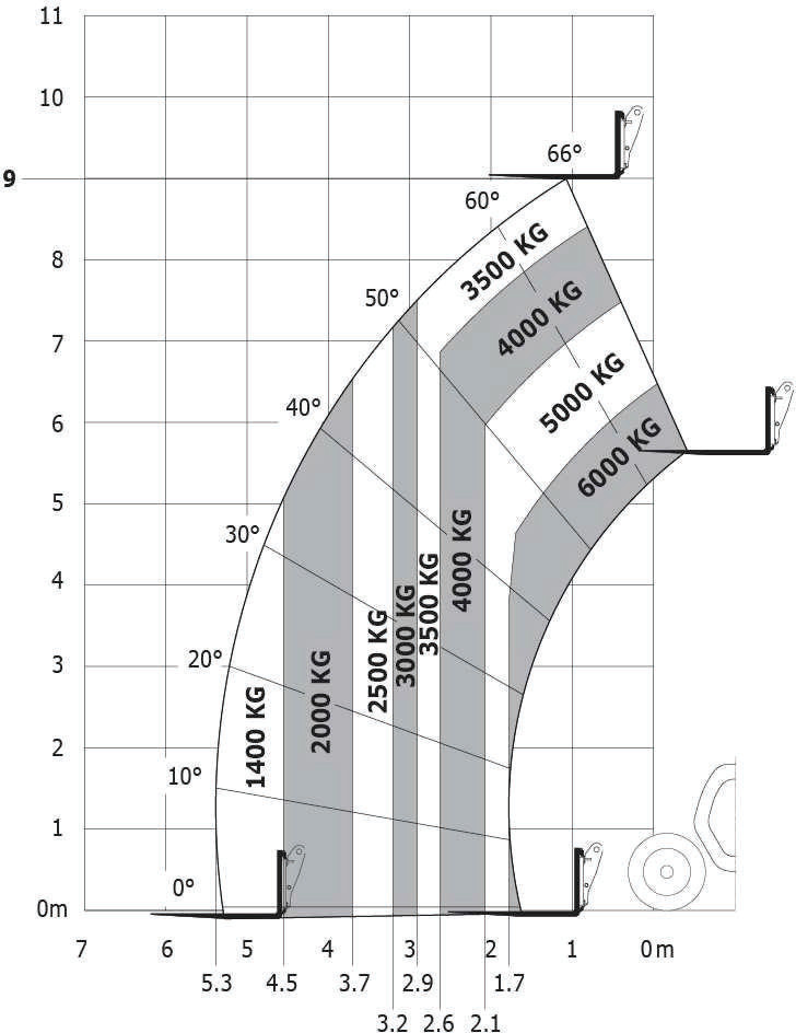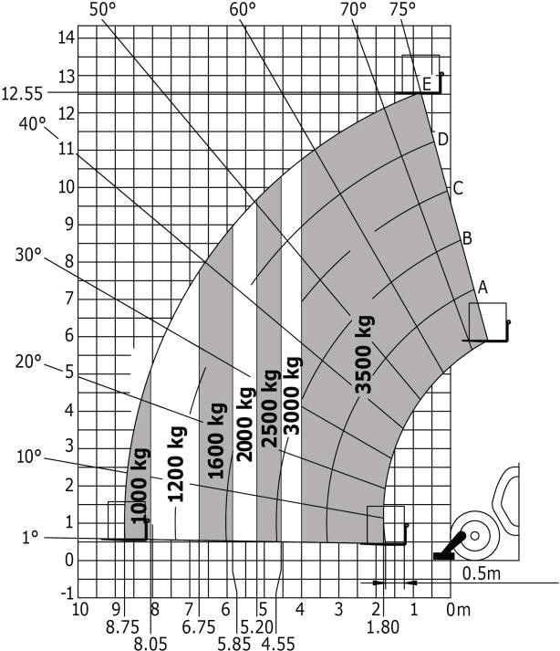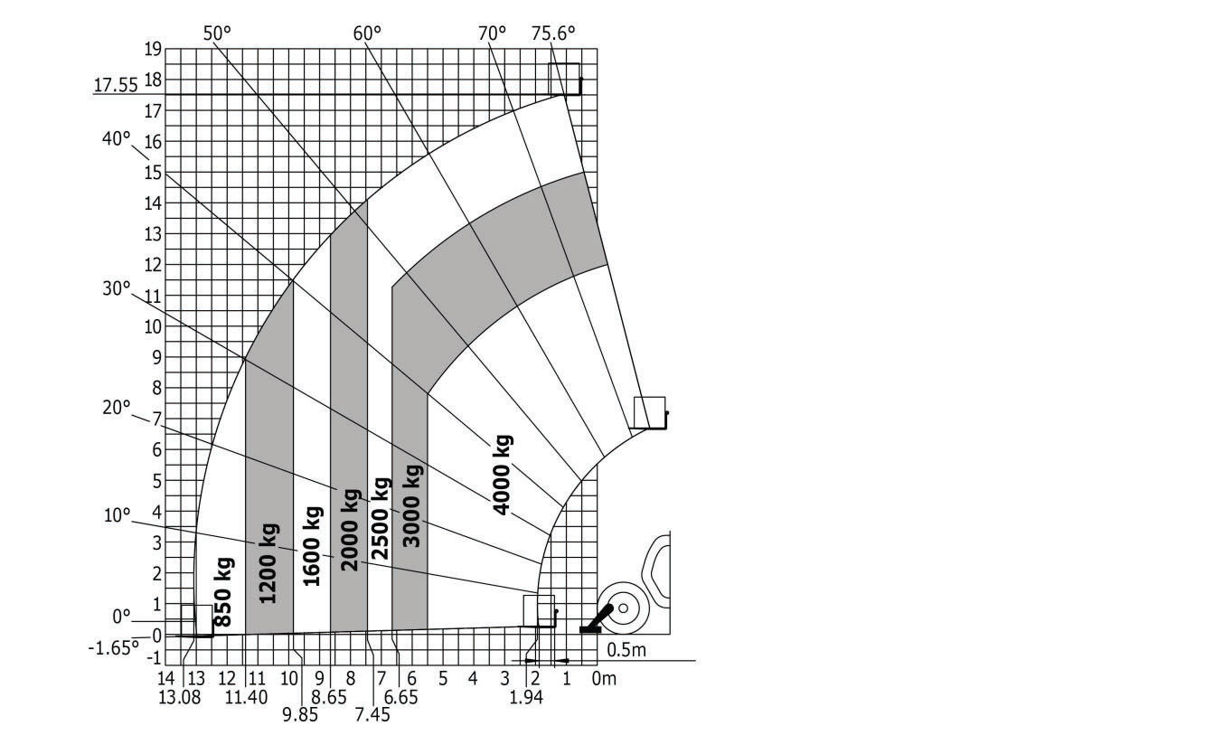 Zgodnie z podanym diagramem maksymalny wysięg ładunku o masie 1,2 t wynosi: