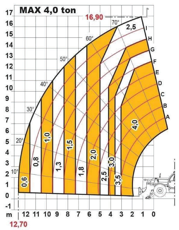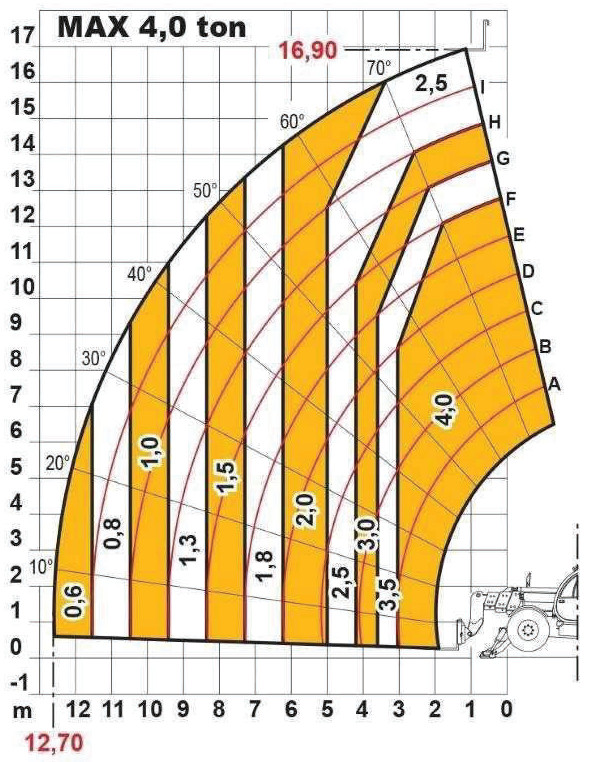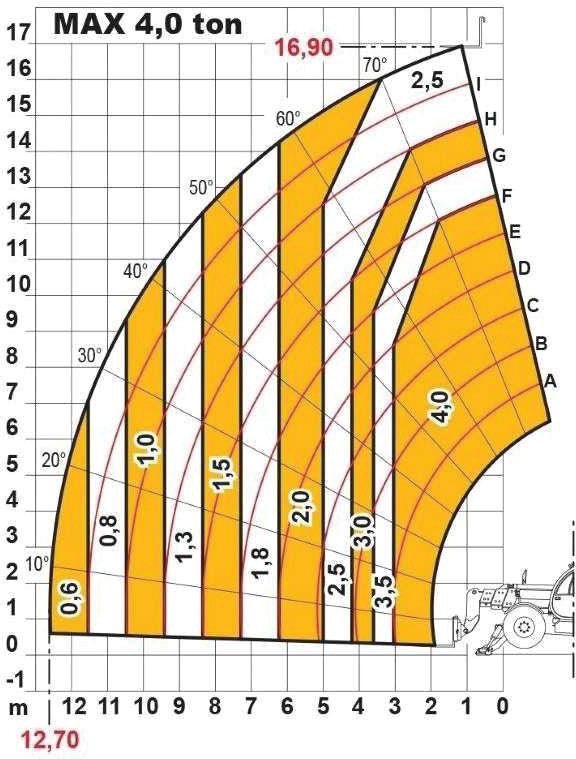 Na podstawie diagramu określ maksymalny wysięg dla ładunku 4,0 t: